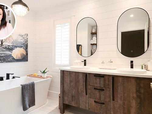 Autant que je me souvienne de ma première rencontre avec mes clients, autant que je ne suis plus certaine si c’est la vasque en pierre de rivière ou le comptoir de noyer que nous avons choisi en premier… À bien y penser, les clients m’ont montré beaucoup d’inspirations de salles de bain différentes, et je voyais le bois de noyer revenir régulièrement, jusqu’à ce qu’ils me demandent ce que je pensais de l’idée d’une vasque en pierre de rivière. À ce moment, c’était clair pour moi, nous avions un combo de départ : la pierre de rivière et le noyer!