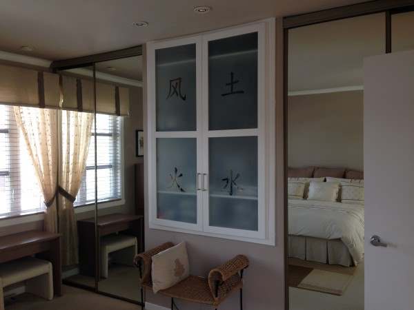 Au niveau des portes de garde-robe, l’option idéale pour conserver l’effet de grandeur et de luminosité était, à mon avis, de conserver les miroirs. Nous avons misé sur le changement de couleur des cadrages de ces dernières. Les portes vitrées de la lingerie ont subi une petite cure de rajeunissement par le remplacement du verre ainsi qu’un travail de teinture pour l’encadrement en bois. Dans ce cas-ci, il ne suffisait que d’épurer et donner un peu de caractère avec le contraste des cadrages. Subtils changements pour un maximum d’effet, n’est-ce pas?