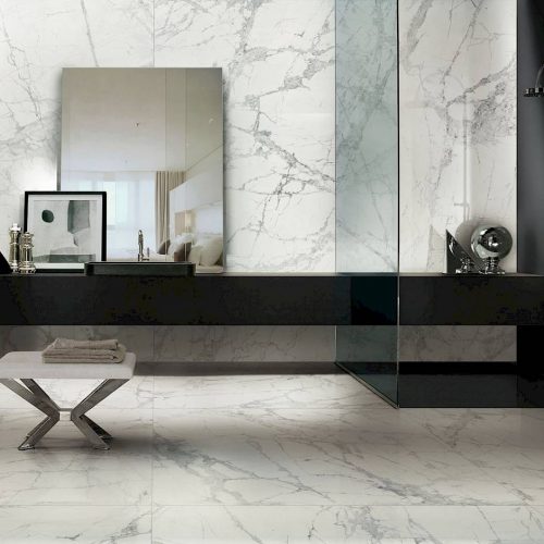 D’année en année, les tuiles de porcelaines sont offertes en formats de plus en plus grands. Bien que ce n’est pas une nouveauté, le marbre occupe une très grande place dans ce type de revêtement et il restera un choix de prédilection en 2020. Le terrazzo a fait son entrée en 2019 et plusieurs s’entendent pour dire qu’il affermira sa place d’une façon encore plus marquée cette année.