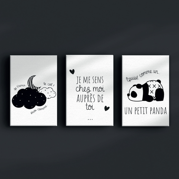 Cadre/toile décoratif collection bébé panda. Imprimé et agrafées sur des cadres de bois.