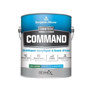 COMMAND de Corotech (Benjamin Moore) est une peinture uréthane à base d’eau pour l’intérieur ou l’extérieur. La polyvalence de sa formule fait en sorte qu’elle peut être appliquée sur la grande majorité des surfaces – autant verticales qu’horizontales- et des matériaux: plancher en béton, rampes d’escalier intérieur en métal, mur en plâtre et/ou cloisons sèches. La rapidité de la remise en service (24h avant la circulation sur les planchers, seulement 15 min pour être sec au toucher) de COMMAND permet de peindre les surfaces commerciales sans avoir à interrompre l’usage des lieux. COMMAND est une peinture idéale pour l’entretien et la maintenance de bâtiments commerciaux ou résidentiels. Sa grande flexibilité et le fait qu’on puisse l’appliquer sur la plupart des surfaces et matériaux permet d’économiser sur l’achat des produits: avec une seule peinture, on peut réaliser presque tous les projets.