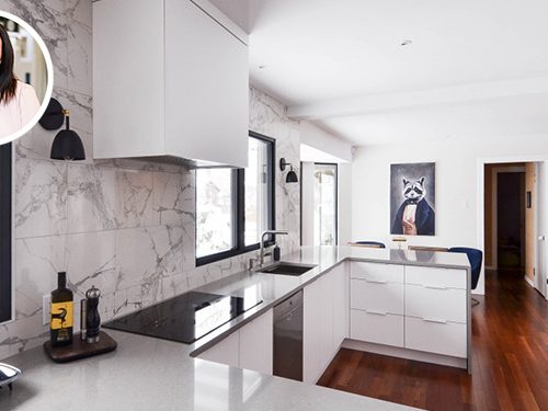 Voici le « avant-après » d’une rénovation de cuisine pour laquelle j’ai eu le mandat de changer les matériaux tout en conservant les armoires. La rénovation devait rester assez raisonnable côté budget mais nous devions éclaircir la pièce. Pourquoi ? Parce que mes clients ont en tête de mettre la maison en vente d’ici les cinq prochaines années…